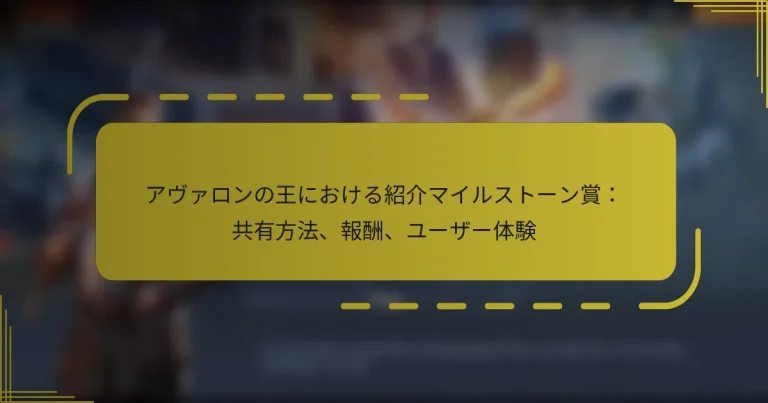 「キング・オブ・アヴァロン」の紹介マイルストーン報酬は、プレイヤーが友達をゲームに招待することで貴重な報酬を獲得する機会を提供します。ソーシャルメディアやゲーム内メッセージなどのさまざまな共有方法を活用することで、プレイヤーは新しい参加者を引き付けるチャンスを高め、報酬を最大化できます。ユーザーの体験は、効果的なコミュニケーションとコミュニティの関与が成功する紹介戦略において重要な役割を果たすことを強調しています。 キング・オブ・アヴァロンの紹介マイルストーン報酬とは? キング・オブ・アヴァロンの紹介マイルストーン報酬は、他のプレイヤーをゲームに招待することで得られる報酬です。これらの報酬は成功した紹介の数に応じて異なり、独占アイテムやボーナスを通じてゲームプレイを大幅に向上させることができます。 異なるマイルストーンでの利用可能な報酬の概要 プレイヤーは、異なる紹介マイルストーンに到達することでさまざまな報酬をアンロックできます。通常、これらのマイルストーンは5、10、20、50の成功した紹介の間隔で設定されています。各レベルはますます価値のある報酬を提供し、プレイヤーがゲームを共有し続けることを促します。 報酬の例には、ゲーム内通貨、特別なアイテム、プレイヤーの能力を向上させるユニークな装備が含まれます。プレイヤーが達成する紹介が多いほど、報酬はより良くなり、プレイヤー間に競争の雰囲気を生み出します。 トップ紹介者のための独占報酬 キング・オブ・アヴァロンのトップ紹介者は、通常のプレイヤーにはない独占報酬にアクセスできます。これらの報酬には、珍しいアイテム、特別な称号、またはゲーム内での地位を示すユニークなスキンが含まれることがよくあります。 さらに、トップ紹介者は資源生成の増加や部隊能力の向上などのボーナスを受け取ることができ、ゲームプレイにおいて大きなアドバンテージを提供します。これにより、プレイヤーは紹介プログラムに積極的に参加し、より高いランキングを目指すようになります。 一般的な報酬とそのゲーム内の利点 紹介プログラムからの一般的な報酬には、建物の建設やアップグレードに必要な金、食料、木材などの資源が含まれます。これらの資源は、プレイヤーがゲーム内でより迅速に進行するのに役立ちます。 金:アイテムの購入や部隊のアップグレードに使用されます。 食料:軍隊の訓練や維持に必要です。 木材:施設の建設やアップグレードに必要です。 資源に加えて、プレイヤーは戦闘効果や防御能力を向上させる装備を受け取ることができ、これらの報酬は新しいプレイヤーと経験豊富なプレイヤーの両方にとって価値があります。 地域やゲームバージョンによる報酬の違い 紹介マイルストーンの報酬は、プレイヤーの地域やプレイしているキング・オブ・アヴァロンの特定のバージョンによって異なる場合があります。たとえば、ヨーロッパのプレイヤーは北アメリカのプレイヤーとは異なる報酬を受け取るかもしれません。 地域ごとのバリエーションには、現地通貨やその地域の文化に響くユニークなアイテムが含まれることもあります。プレイヤーは、自分の地域で利用可能な特定の報酬を理解するために、ゲームの公式発表を確認する必要があります。 期間限定の報酬とイベント キング・オブ・アヴァロンは、特別な紹介報酬を提供する期間限定イベントを頻繁に開催します。これらのイベントは緊急性を生み出し、プレイヤーが特定の期間内に友達を招待して報酬を最大化することを促します。 これらのイベント中、プレイヤーはプロモーション期間外では入手できない独占アイテムやボーナスを獲得することがあります。期間限定のイベントに参加することで大きなアドバンテージを得ることができるため、プレイヤーは今後の機会について情報を得ておくべきです。 プレイヤーはキング・オブ・アヴァロンで効果的に紹介を共有するにはどうすればよいですか? プレイヤーは、ソーシャルメディア、ゲーム内メッセージ、個人的なネットワークなどのさまざまな方法を活用することで、キング・オブ・アヴァロンで効果的に紹介を共有できます。これらの戦略は、新しいプレイヤーを引き付けるチャンスを高めるだけでなく、紹介システムを通じて得られる報酬を最大化します。 紹介リンクを共有するためのステップバイステップガイド 紹介リンクを効果的に共有するには、まずゲームの設定またはアカウントセクションから自分のユニークな紹介リンクにアクセスします。リンクをクリップボードにコピーして、簡単に共有できるようにします。 次に、好みの共有方法を選択します。テキストメッセージ、メール、またはソーシャルメディアプラットフォームを介してリンクを送信できます。友達が参加するように促すために、メッセージをパーソナライズすることを忘れないでください。 最後に、リン