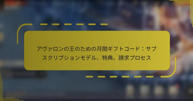「キング・オブ・アヴァロン」の月間ギフトコードは、プレイヤーが貴重なゲーム内報酬と引き換えられるプロモーションコードであり、全体的なゲーム体験を向上させます。さまざまなモデルに登録することで、プレイヤーは異なるティアや特典に合わせた独占的なギフトコードにアクセスできます。これらのコードを取得するプロセスは簡単で、プレイヤーはゲームの指定されたセクションにコードを入力することで報酬をアンロックできます。 「キング・オブ・アヴァロン」の月間ギフトコードとは? 「キング・オブ・アヴァロン」の月間ギフトコードは、プレイヤーがゲーム内報酬と引き換えられるプロモーションコードです。これらのコードは定期的にリリースされ、ゲーム体験を向上させるさまざまな特典を提供します。 ギフトコードの定義と目的 ギフトコードは、プレイヤーがゲーム内で入力してリソース、アイテム、またはブーストなどの報酬を受け取るためのユニークな英数字の文字列です。その主な目的は、プレイヤーのエンゲージメントを促進し、忠誠心に報いることです。 これらのコードはしばしばプロモーションツールとして機能し、開発者が新しいプレイヤーを参加させたり、既存のプレイヤーをアクティブに保つことを促します。貴重なゲーム内アイテムを提供することで、プレイヤーはゲームを続けたり、時間を投資したりする可能性が高くなります。 利用可能なギフトコードの種類 「キング・オブ・アヴァロン」には、異なる報酬を提供するいくつかの種類のギフトコードがあります。一般的な種類には以下が含まれます: リソースコード - ゲーム内通貨や素材を提供します。 アイテムコード - 特定のアイテムや装備を付与します。 ブーストコード - 生産速度の向上など、ゲームプレイに一時的な強化を提供します。 これらのコードは、その価値や提供する特典の期間が異なる場合があるため、プレイヤーは最新のリリース情報を常に把握しておくことが重要です。 リリースと更新の頻度 月間ギフトコードは通常、毎月の初めにリリースされ、プロモーションイベントやゲームのアップデートに合わせて行われます。プレイヤーは定期的に新しいコードを期待でき、公式チャンネル(ソーシャルメディアやゲーム内通知など)を通じて発表されることが多いです。 これらのリリースについて情報を得ておくことは重要です。いくつかのコードには有効期限や限られた利用可能性があるため、プレイヤーは貴重な報酬を逃さないように頻繁に更新を確認する必要があります。 ギフトコードがゲームプレイを向上させる方法 ギフトコードは、プレイヤーに必要なリソースやアイテムを提供することで、ゲームプレイを向上させます。たとえば、追加のリソースを受け取ることで、プレイヤーは都市や軍隊をより迅速にアップグレードできます。 さらに、ギフトコードを使用することで、素材を集めるための時間を短縮でき、プレイヤーは戦略的なゲームプレイやゲームのストーリーを楽しむことに集中できます。これにより、全体的により満足感のある魅力的な体験が得られます。 ギフトコードの一般的な別名 「キング・オブ・アヴァロン」のギフトコードは、コミュニティ内でさまざまな名前で呼ばれることがあります。一般的な別名には以下が含まれます: プロモコード リデームコード リワードコード これらの用語を理解することで、プレイヤーはフォーラムやソーシャルメディアでの議論をスムーズに進め、最新のコードを他の人と簡単に見つけたり共有したりできます。 ギフトコードのために利用可能なサブスクリプションモデルは何ですか? 「キング・オブ・アヴァロン」では、プレイヤーが独占的なギフトコードにアクセスできるさまざまなサブスクリプションモデルを提供しています。これらのモデルは通常、異なるティアを含み、それぞれが多様なプレイヤーのニーズに応じたユニークな特典と価格構造を提供します。 サブスクリプションティアの概要 「キング・オブ・アヴァロン」のサブスクリプションティアは、一般的に基本、スタンダード、プレミアムのオプションを含みます。各ティアは、プレイヤーのエンゲージメントや投資のレベルに応じて設計されています。基本ティアは通常、基本的な特典を提供し、プレミアムティアは最も広範な特典を提供します。 プレイヤーは、自分のゲームプレイの頻度や望む報酬に基づいてティアを選択できます。たとえば、カジュアルプレイヤーは基本ティアを選ぶかもしれませんが、熱心なプレイヤーはプレミアムティアにより大きな価値を見出すかもしれません。 ....